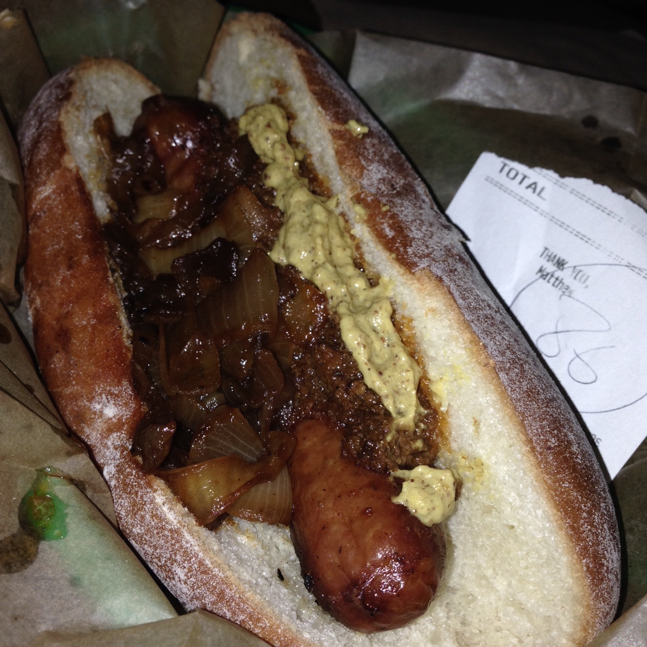 Anyway, let us progress, both in maturity and time, to the first bite. The snap was present, not strong, but present. The flavor was robust, sort of smoky, but not over-bearing, and the overall wiener size was a little less that desired, but, overall no complaint. Also, it wasn’t quite as hot as I wanted, lacked char, and could have been cooked more. I’ll cut them a little break since it was super busy on Saturday afternoon, but, as Yogi Berra once said, “ya gotsta cook ya weenies.”