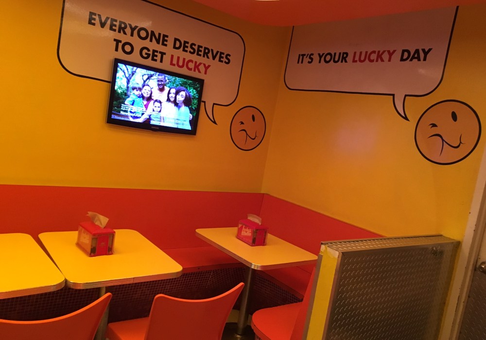 The bun is supportive of its contents, thick, and well-toasted. I’m about 84% sure it is a potato roll, but for some reason I can’t tell because the whole room is yellow from the ceiling lights. I know the frank is a Hebrew National, because it is advertised as such. It is an average sausage, and cutting it in half does always eliminate the snap. However, no snap here is not a problem because the focus was totally on the chili and cheese. I kind of wish there was no onion, but it didn’t hurt the overall taste at all because the chili was so on point. Lucky’s advertises the chili as Angus, so I can infer that it is imported. As an importer/exporter, I can respect the decision to import from Texas here. Hook ’em horns.